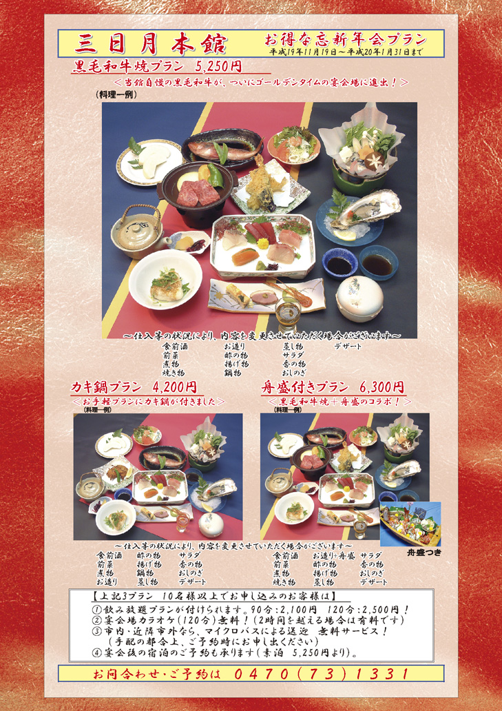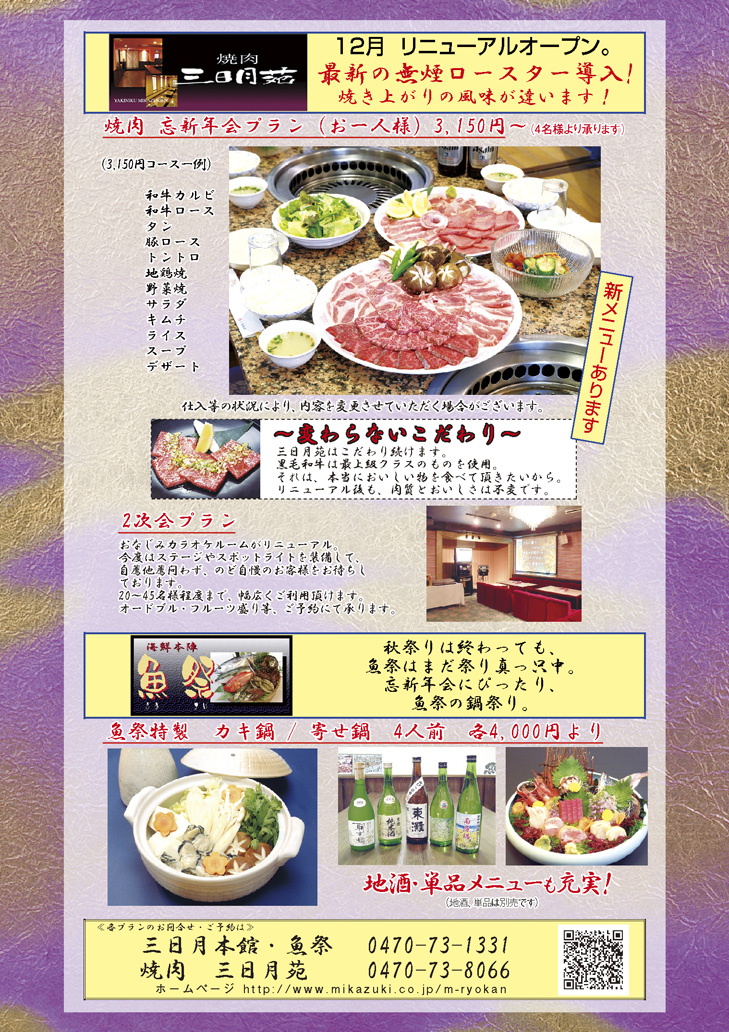 日記担当、めたぼ太郎です。 今日は、魚祭の冬だけの限定メニューのご紹介です。 まず、冬の味覚の王様、あんこう鍋。 身は淡白ですがぷりぷりとした食感、あん肝はぐっと濃厚な旨みが凝縮されていて、どちらも美味です。さすが、骨しか捨てるところの無い魚の面目躍如です。 わざわざ遠くまで行かずとも、魚祭であんこう鍋食べられます。 「あんこう鍋は勝浦に限る。」現代版、目黒のさんまのお話です。しかも、勝浦なら、これからがまさに旬の金目との掛け持ちもできます。そんなちょっとした贅沢はいかがでしょうか。 続きまして、カキ鍋。 カキは海のミルクとも呼ばれ、肝機能を改善したりコレステロールを減少させる働きをもつ、タウリンという成分を多く含むそうです。リポビタンDもびっくり。 ・・・なんて健康情報番組の受け売りのようなふれこみが無くても、おいしいですよね、カキ。わざわざ本場に行く交通費を考えたら、魚祭で何倍食べられるんでしょうか。 「カキ鍋も勝浦に限る。」当店では、生ガキもご用意しております。勝浦なら、地魚料理として脚光を浴びるなめろうやさんが焼も楽しめます。そんな欲張りなプランニングもおすすめです。 お値段は、あんこう鍋は5,000円、カキ鍋は4,000円で、いずれもおおよそ3~4人前見当です。 時に今、忘年会シーズン。せっかく鍋をつつくなら、お座敷がいいですよね。最近、お座敷を指定されるお客様が増えてきていますので、鍋ともども、ご予約いただくほうが確実です。 ≪ご予約はこちらまでお願い致します。≫ 電話:0470-73-1331 (三日月本館代表電話となっております) ご予約・お問合せお待ちいたしております。 「あんこう鍋とカキ鍋は勝浦に限る。」をキーワードに・・・というところですが、もうひとつ、「魚祭(うおさい)」の店名も、お忘れなきよう、よろしくお願い申し上げます。 |