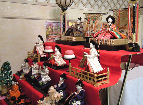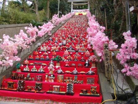 まもなく毎年恒例の「かつうらビッグひな祭り」が21日から始まります。最近は見物のお客様もだいぶ増え、南はブラジルから北はフィンランドまで・・・は言いすぎですね。いや、本当に関東近県はもちろん、北海道から九州にいたるまで、全国各所からお客様がいらっしゃるようになりました。 今年はついにひな人形が30,000体を超えたそうで、勝浦市の人口を大幅リード。すでに逆転は難しい域に達しました。べつに競争しているわけではありませんが。 去年もご覧にいれましたが、ほら。 なんの役の人形が何体いるのか、ぜひ数えてみてください。 (数えたら、こっそり教えてくださいね) そして当館にもひな祭りが。 玄関前に、毎年恒例のひな段を飾りました。駅前へお越しの際はぜひお立ち寄りください。海鮮本陣 魚祭(うおさい)もフル回転営業中です。 あ、おひな様、ちょっとカメラ目線ですね。滝川クリステルさんをイメージですか???