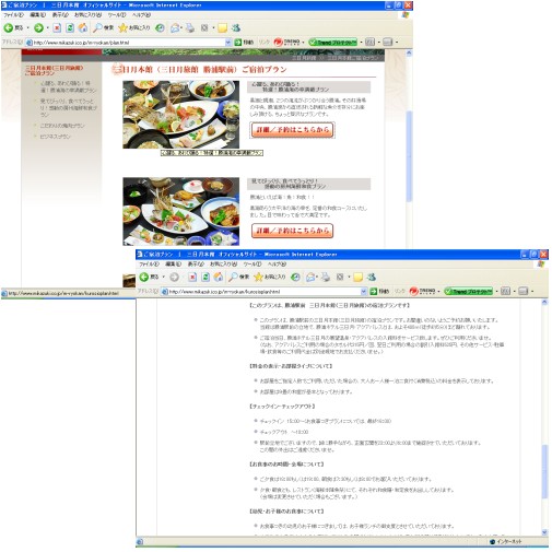 今回で、ブログ開始からの記事が75回を記録しました! ひとえにご愛読いただいた、5千余の皆様のおかげです。 この勢いで、103回とか1327回とか、祝ってみたいものです。 それはさておき、今回のお知らせは、 三日月本館(三日月旅館)のホームページが(プチ)リニューアル! しました、ということです。 ホームページがホテル三日月グループのサーバを間借りしているので、お客様がお間違いにならないよう、ご案内を充実させました。 間借りというのにあやかって、当館の予約サイトも「やどかり」とか、小粋な名前をつけてみたい、というのは言いすぎでしょうか。 また、ご宿泊プランごとに、お客様からお問い合わせの多い事項をひとまとめにして掲載しましたので、ご検討の際はぜひご一読いただけたらと思います。 画面イメージを載せておきますね。文字までは見えませんので、 実物は http://www.mikazuki.co.jp/m-ryokan/plan.html をどうぞ。 ついでにこのブログも、これからも引き続きよろしくお願いします。 ≪三日月本館(三日月旅館) 宿泊予約のサイトのご案内です!≫ そんなプチリニューアルしたホームページから、インターネットで直接宿泊予約が出来ます。 ご利用は、まずインターネットの画面から会員登録をしていただき、その後で実際に日にち、人数、宿泊プランを決めて予約をするという流れです。 ※会員登録だけでは予約は完了しません。ご注意ください。また、当館はホテル三日月とは別施設(駅前旅館)です。お間違いのないよう、ご予約くださいませ。 「プッシュホンのボタンが押しにくい・・・」とお嘆きの方に! プッシュホン無理して使わなくてもいいんです。インターネットなら、画面から予約を入れていただけます! しかも勝浦駅から歩くこと1分弱。 食欲の秋。ぜひ勝浦でおなかもココロも満たしてください。 ≪↓↓↓ご利用はこちらからどうぞ↓↓↓≫ http://www.mikazuki.co.jp/m-ryokan/plan.html