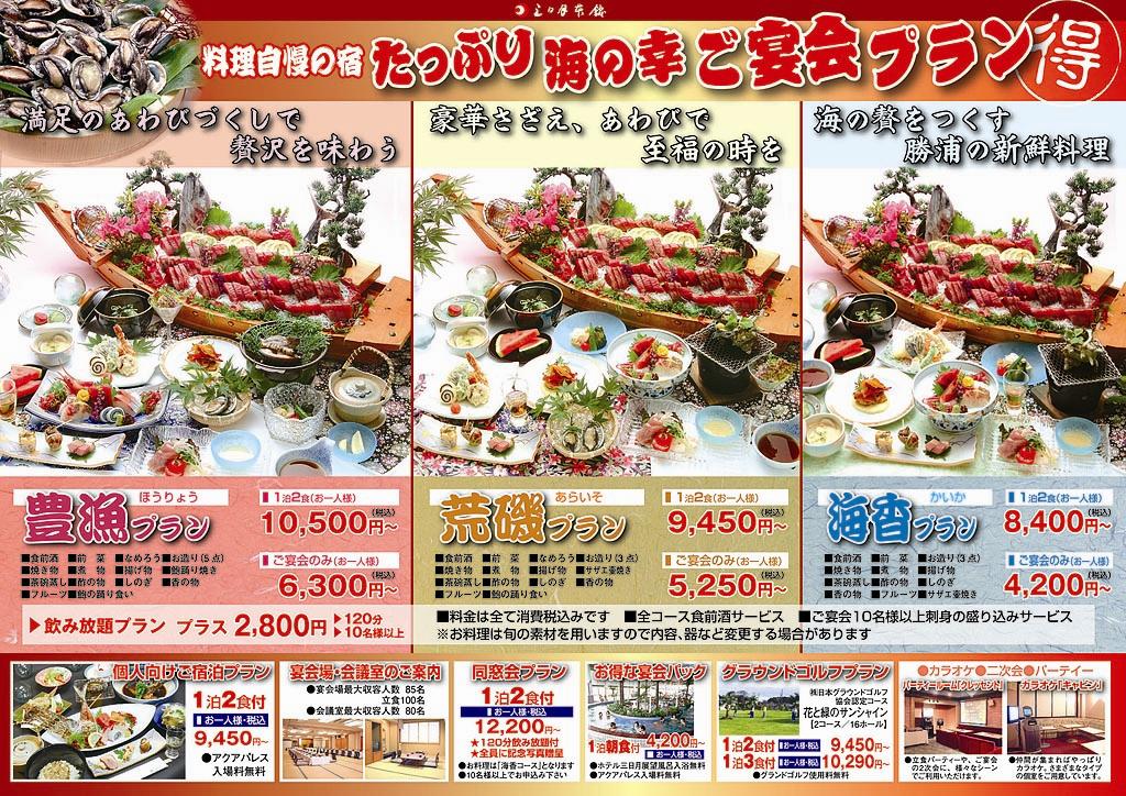今回のタイトルをよく見ると、何か言っているようでいて、結局何も言ってない感じがしますね。 さて、恒例(?)の忘新年会チラシwebサービス。 サービスと言っても、画像でupしただけですが、「こんなプランやってるのね・・・。」とご参考になれば、と思います。 なお、【裏面】記載の宴会プランは、10名様以上の場合の料金です。9名様までの場合は別途ご相談ください。 ※サイズがたいへん大きいので注意してください。サムネイルをクリックすると大きくなります。 ちょっとざらざらしてますが、本物のチラシはもっとツルツルして光沢のある用紙です。webではその質感まで伝わらないのが残念です。 ・・・え、そんなの必要ない? 名前は「裏」ですが、その実、プランがしっかり載っているのはこっちだったりする、ちょっとした罠。ヒット曲のレコードやCDで、意外とB面とかC/Wの曲が良かったりする、ってところでしょうか。・・・いや、ゼッタイ違いますね。 当館では、忘年会・新年会のご予約を受付中です。 あわせて、2008年の日本一遅い新年会も、絶賛応援中です。 ご予約・お問い合わせは・・・ 0470-73-1331(代表)までどうぞ。お待ちしております。 PR